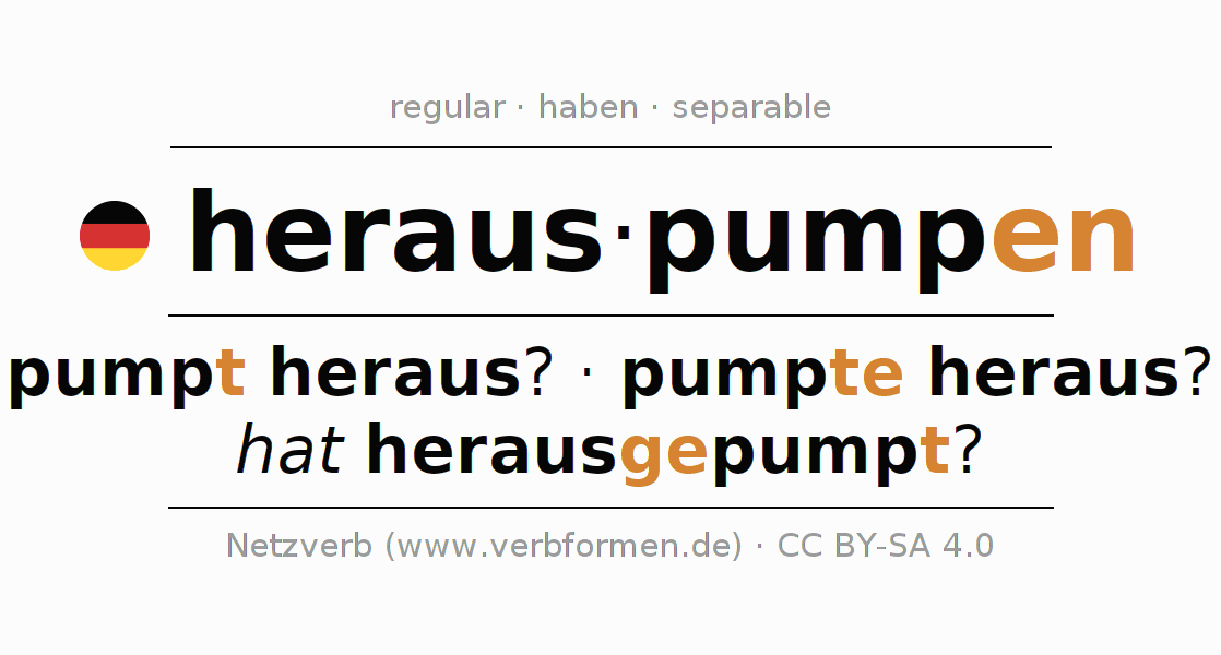 The verb herauspumpen fully conjugated in all persons and numbers in the Infinitive Present Perfect