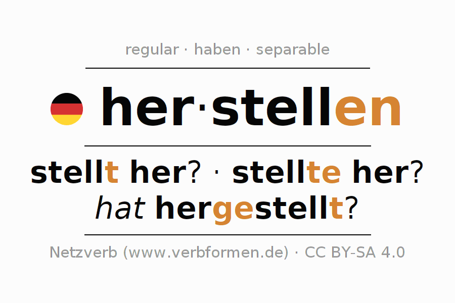 The conjugation of herstellen in Infinitive Present Perfect base form Active is herstellen, herzustellen.The conjugation corresponds to certain grammatical rules. Likewise the requirements for the conjugation of the simple verb forms of herstellen in Infinitive. Comments ☆