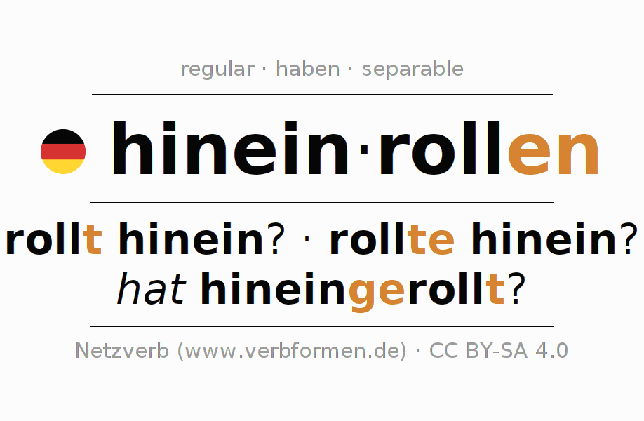 The verb hineinrollen (hat) fully conjugated in all persons and numbers in the Infinitive Present Perfect
