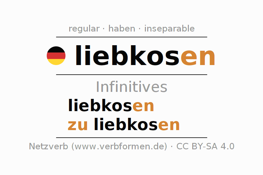 The conjugation of liebkosen in Infinitive Present Perfect base form Active is liebkosen, zu liebkosen.The conjugation corresponds to certain grammatical rules. Likewise the requirements for the conjugation of the simple verb forms of liebkosen in Infinitive. Comments ☆