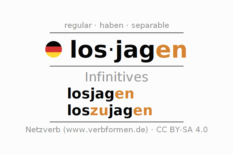 The conjugation of losjagen in Infinitive Present Perfect base form Active is losjagen, loszujagen.The conjugation corresponds to certain grammatical rules. Likewise the requirements for the conjugation of the simple verb forms of losjagen in Infinitive. Comments ☆