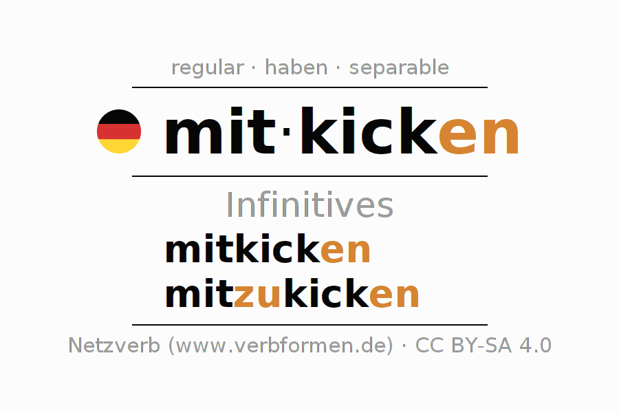 The conjugation of mitkicken in Infinitive Present Perfect base form Active is mitkicken, mitzukicken.The conjugation corresponds to certain grammatical rules. Likewise the requirements for the conjugation of the simple verb forms of mitkicken in Infinitive. Comments ☆