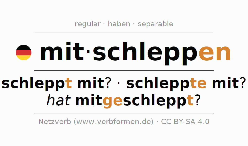 The verb mitschleppen fully conjugated in all persons and numbers in the Infinitive Present Perfect