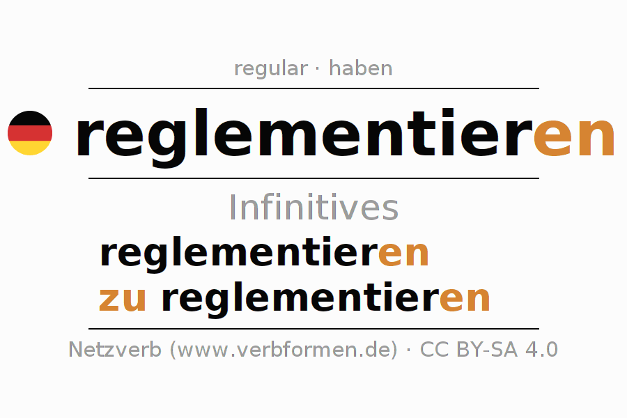 The verb reglementieren fully conjugated in all persons and numbers in the Infinitive Present Perfect