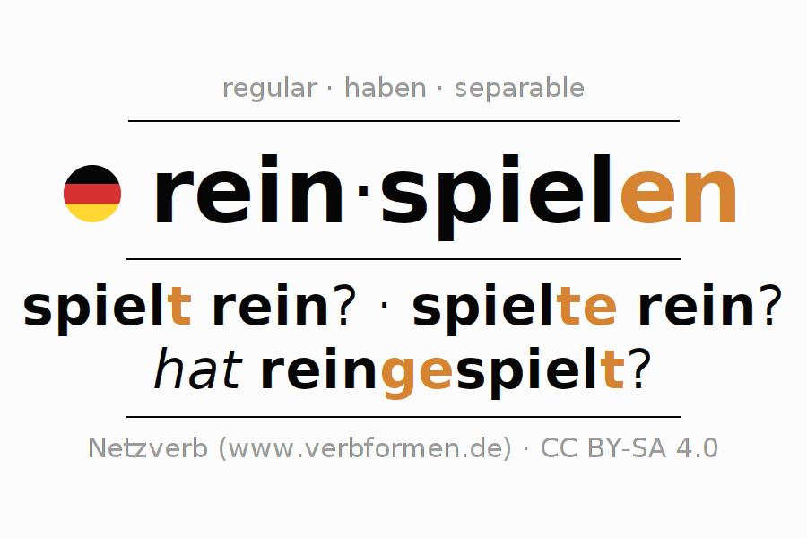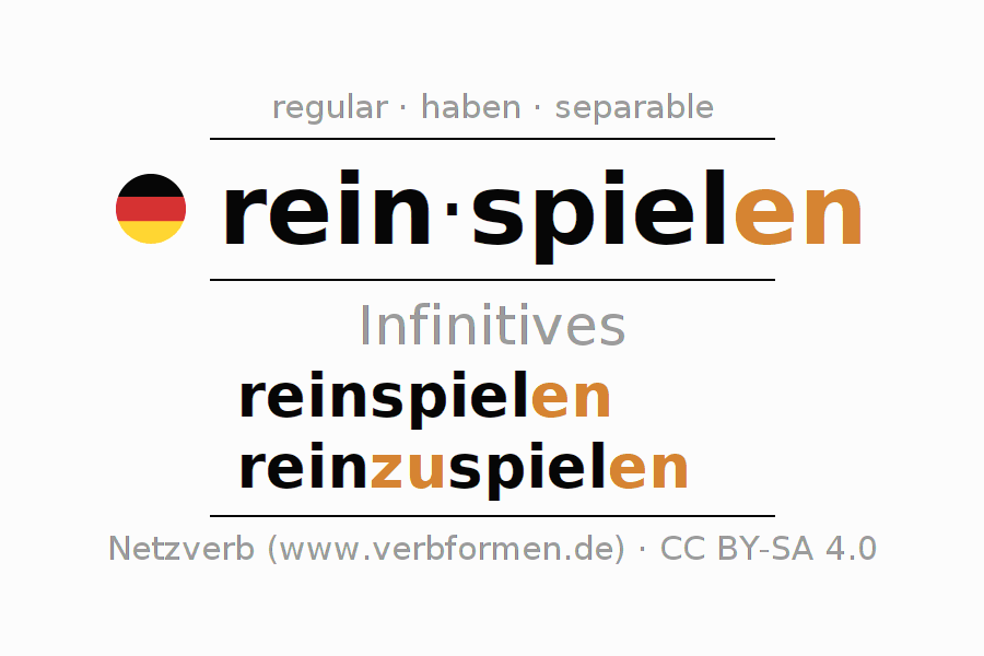 The conjugation of reinspielen in Infinitive Present Perfect base form Active is reinspielen, reinzuspielen.The conjugation corresponds to certain grammatical rules. Likewise the requirements for the conjugation of the simple verb forms of reinspielen in Infinitive. Comments ☆