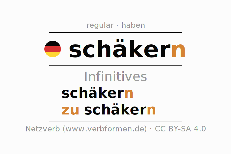 The conjugation of schäkern in Infinitive Present Perfect base form Active is schäkern, zu schäkern.The conjugation corresponds to certain grammatical rules. Likewise the requirements for the conjugation of the simple verb forms of schäkern in Infinitive. Comments ☆
