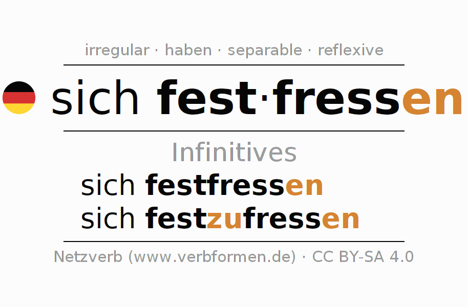 The conjugation of sich festfressen in Infinitive Present Perfect base form Active is sich festfressen, sich festzufressen.The conjugation corresponds to certain grammatical rules. Likewise the requirements for the conjugation of the simple verb forms of festfressen in Infinitive. Comments ☆