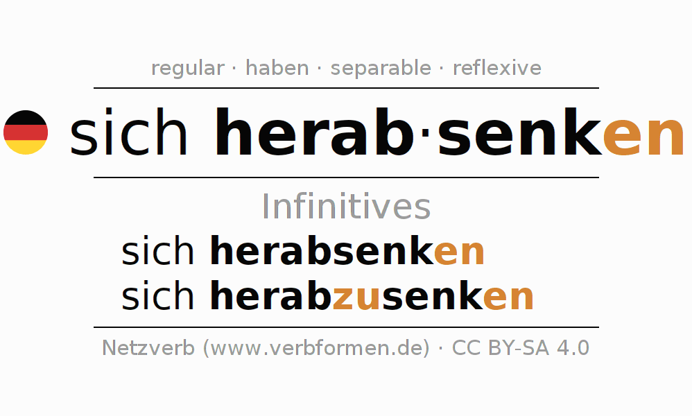 The verb sich herabsenken fully conjugated in all persons and numbers in the Infinitive Present Perfect