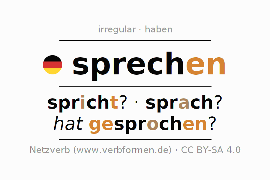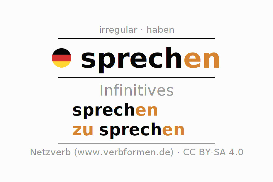 The conjugation of sprechen in Infinitive Present Perfect base form Active is sprechen, zu sprechen.The conjugation corresponds to certain grammatical rules. Likewise the requirements for the conjugation of the simple verb forms of sprechen in Infinitive. 5Comments ☆5.0