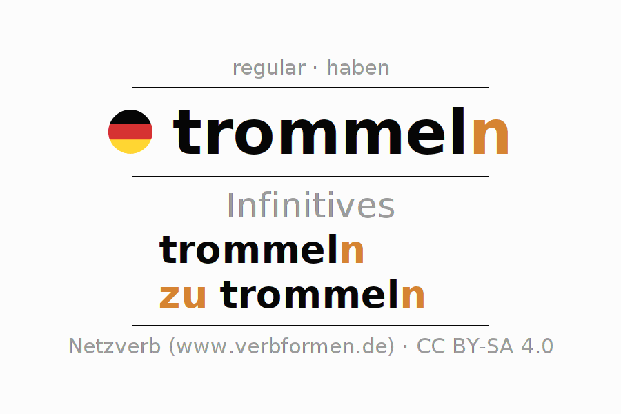 The conjugation of trommeln in Infinitive Present Perfect base form Active is trommeln, zu trommeln.The conjugation corresponds to certain grammatical rules. Likewise the requirements for the conjugation of the simple verb forms of trommeln in Infinitive. Comments ☆