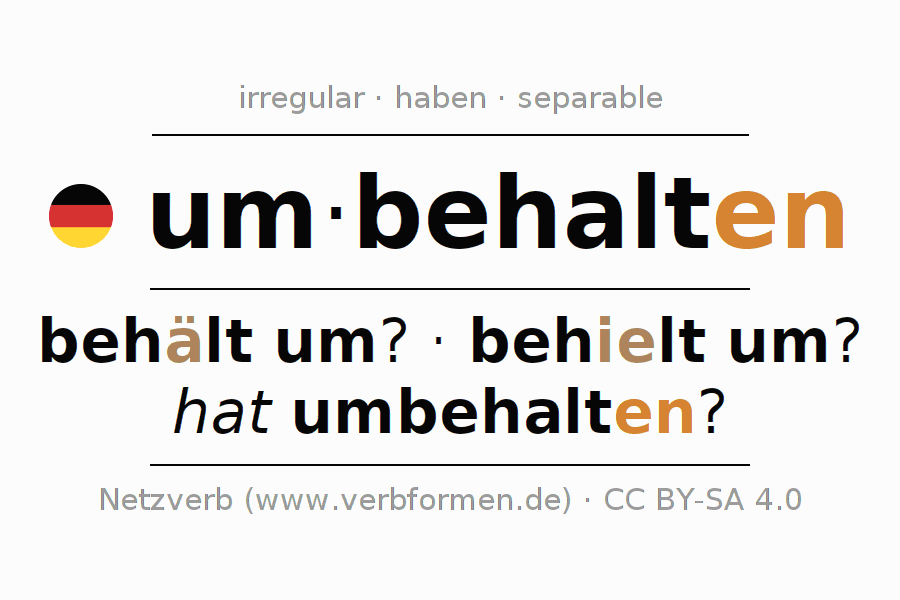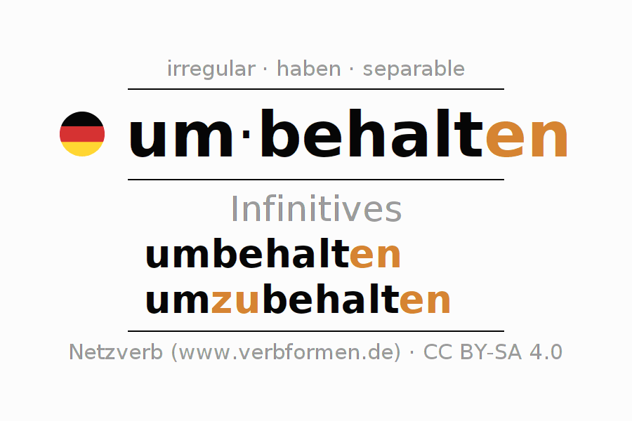 The conjugation of umbehalten in Infinitive Present Perfect base form Active is umbehalten, umzubehalten.The conjugation corresponds to certain grammatical rules. Likewise the requirements for the conjugation of the simple verb forms of umbehalten in Infinitive. Comments ☆