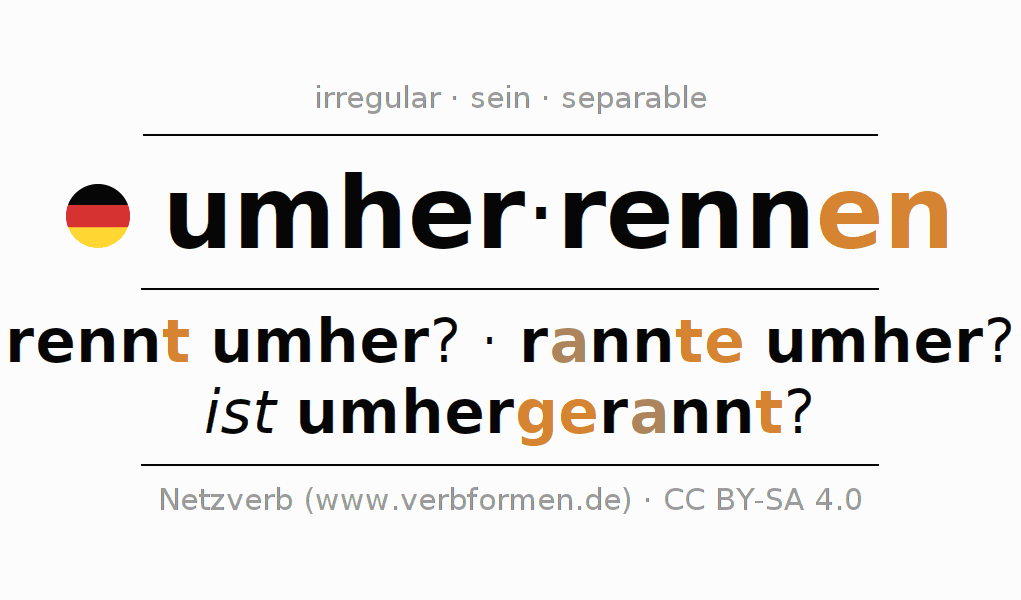 The conjugation of umherrennen in Infinitive Present Perfect base form Active is umherrennen, umherzurennen.The conjugation corresponds to certain grammatical rules. Likewise the requirements for the conjugation of the simple verb forms of umherrennen in Infinitive. Comments ☆
