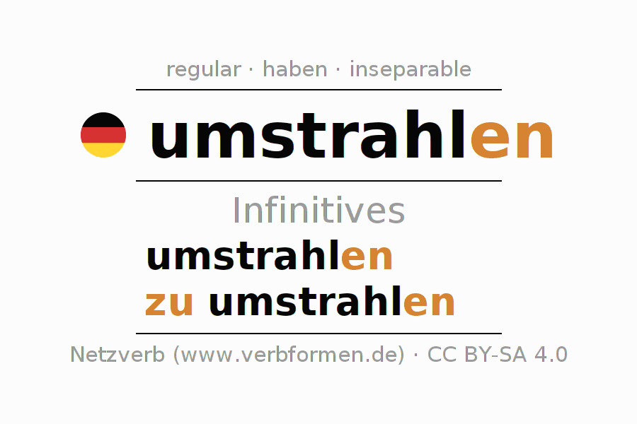 The conjugation of umstrahlen in Infinitive Present Perfect base form Active is umstrahlen, zu umstrahlen.The conjugation corresponds to certain grammatical rules. Likewise the requirements for the conjugation of the simple verb forms of umstrahlen in Infinitive. Comments ☆