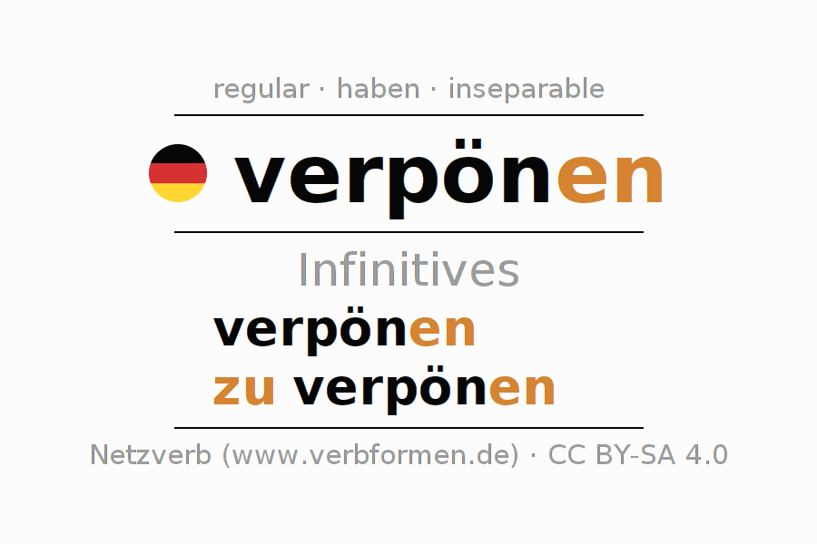 The conjugation of verpönen in Infinitive Present Perfect base form Active is verpönen, zu verpönen.The conjugation corresponds to certain grammatical rules. Likewise the requirements for the conjugation of the simple verb forms of verpönen in Infinitive. Comments ☆
