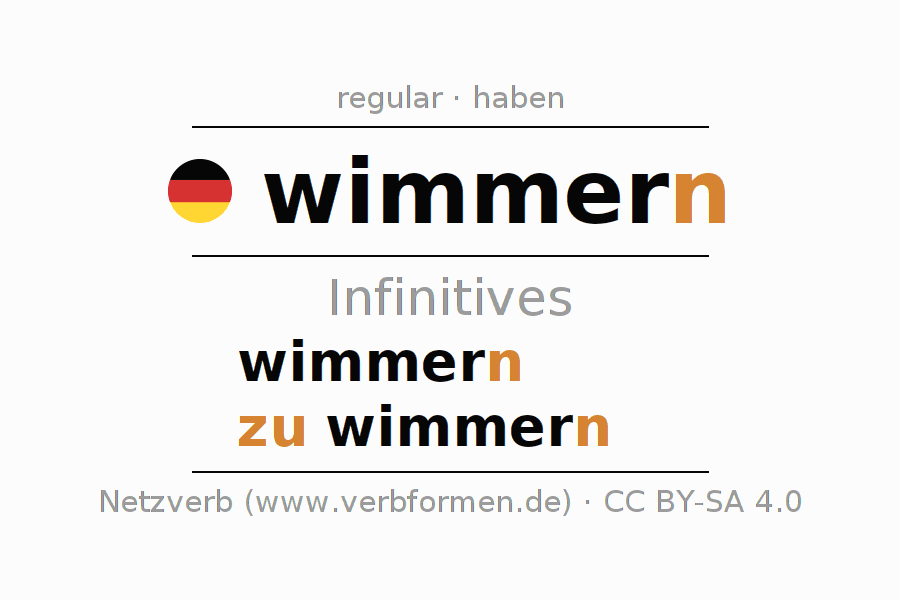 The conjugation of wimmern in Infinitive Present Perfect base form Active is wimmern, zu wimmern.The conjugation corresponds to certain grammatical rules. Likewise the requirements for the conjugation of the simple verb forms of wimmern in Infinitive. Comments ☆