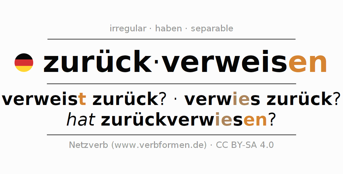 The conjugation of zurückverweisen in Infinitive Present Perfect base form Active is zurückverweisen, zurückzuverweisen.The conjugation corresponds to certain grammatical rules. Likewise the requirements for the conjugation of the simple verb forms of zurückverweisen in Infinitive. Comments ☆