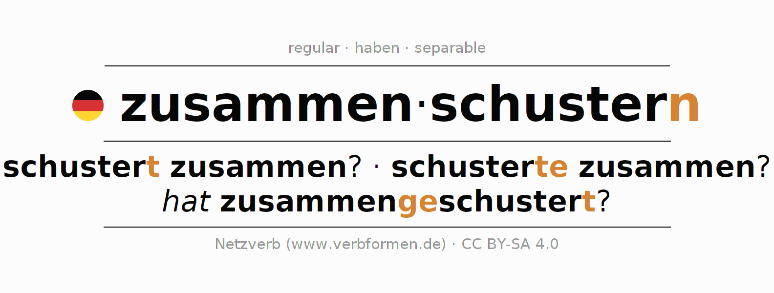 The verb zusammenschustern fully conjugated in all persons and numbers in the Infinitive Present Perfect