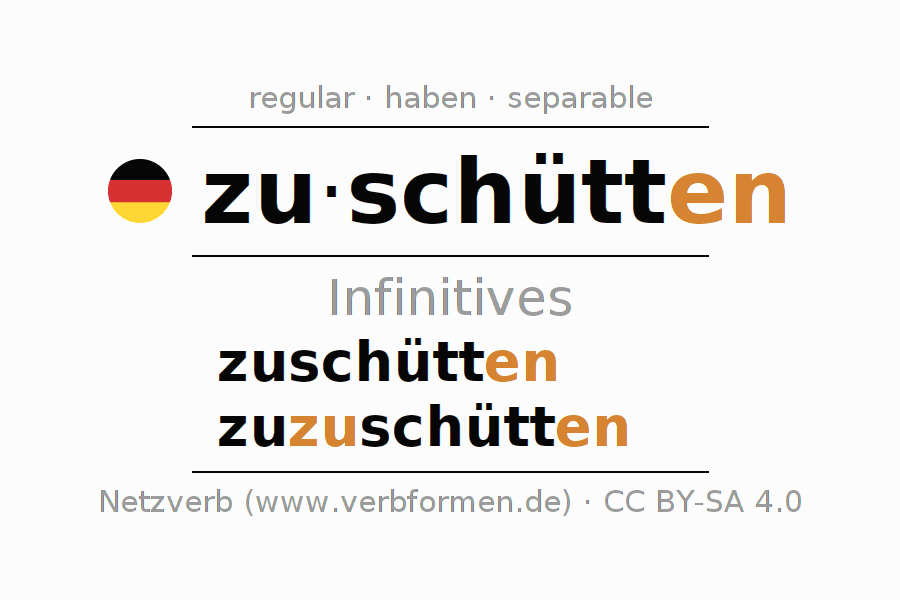 The conjugation of zuschütten in Infinitive Present Perfect base form Active is zuschütten, zuzuschütten.The conjugation corresponds to certain grammatical rules. Likewise the requirements for the conjugation of the simple verb forms of zuschütten in Infinitive. Comments ☆