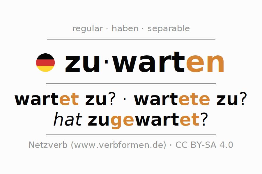 The conjugation of zuwarten in Infinitive Present Perfect base form Active is zuwarten, zuzuwarten.The conjugation corresponds to certain grammatical rules. Likewise the requirements for the conjugation of the simple verb forms of zuwarten in Infinitive. Comments ☆
