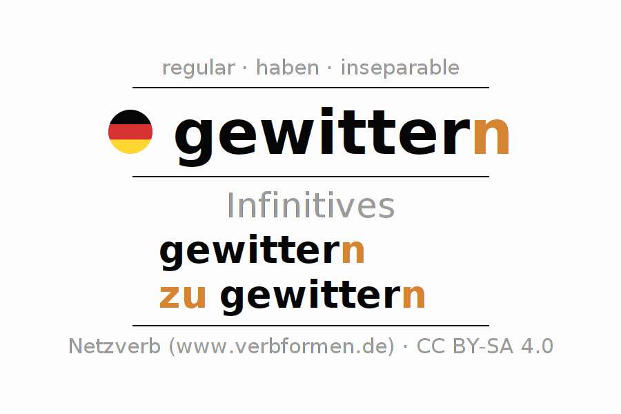 The verb gewittern fully conjugated in all persons and numbers in the Infinitive Present Perfect