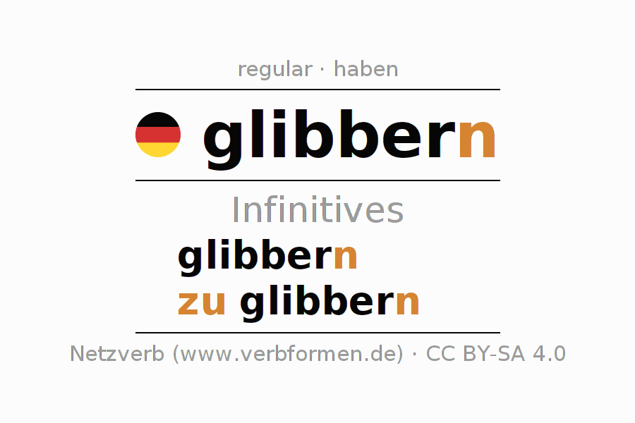 The infinitives of glibbern (slide, slip) are: glibbern, zu glibbern. The ending -n, shortened by an "e", is appended to the verb stem glibber, since the stem ends with -er. When forming the infinitive with zu, the "zu" is prepended to the verb, since it has no separable first parts. The formation of the forms corresponds to the grammatical rules for the conjugation of verbs in the infinitive. Comments ☆