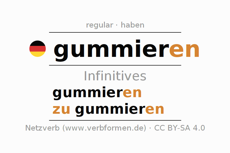The infinitives of gummieren (gum, rubberize) are: gummieren, zu gummieren. The ending -en is appended to the verb stem gummier. When forming the infinitive with zu, the "zu" is prepended to the verb, since it has no separable first parts. The formation of the forms corresponds to the grammatical rules for the conjugation of verbs in the infinitive. Comments ☆