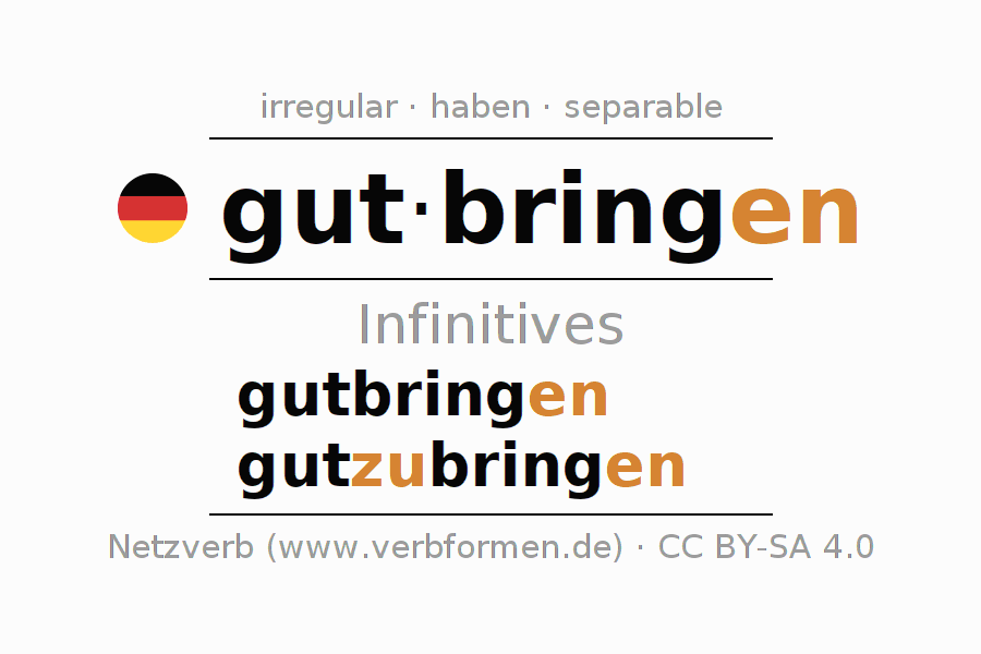The infinitives of gutbringen (compensate, credit) are: gutbringen, gutzubringen. The ending -en is appended to the verb stem bring. When forming the infinitive with zu the "zu" is inserted after the separable first part gut-. The formation of the forms corresponds to the grammatical rules for the conjugation of verbs in the infinitive. Comments ☆