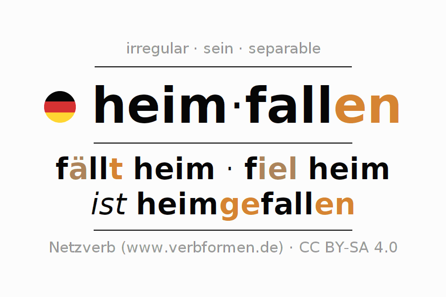 The verb heimfallen fully conjugated in all persons and numbers in the Infinitive Present Perfect