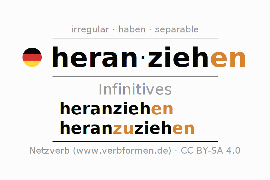 The infinitives of heranziehen (engage, use) are: heranzieh(e)n, heranzuzieh(e)n. The ending -en is appended to the verb stem zieh. When forming the infinitive with zu the "zu" is inserted after the separable first part heran-. The formation of the forms corresponds to the grammatical rules for the conjugation of verbs in the infinitive. Comments ☆