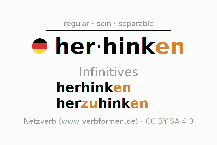 The infinitives of herhinken (trail, hobble up) are: herhinken, herzuhinken. The ending -en is appended to the verb stem hink. When forming the infinitive with zu the "zu" is inserted after the separable first part her-. The formation of the forms corresponds to the grammatical rules for the conjugation of verbs in the infinitive. Comments ☆