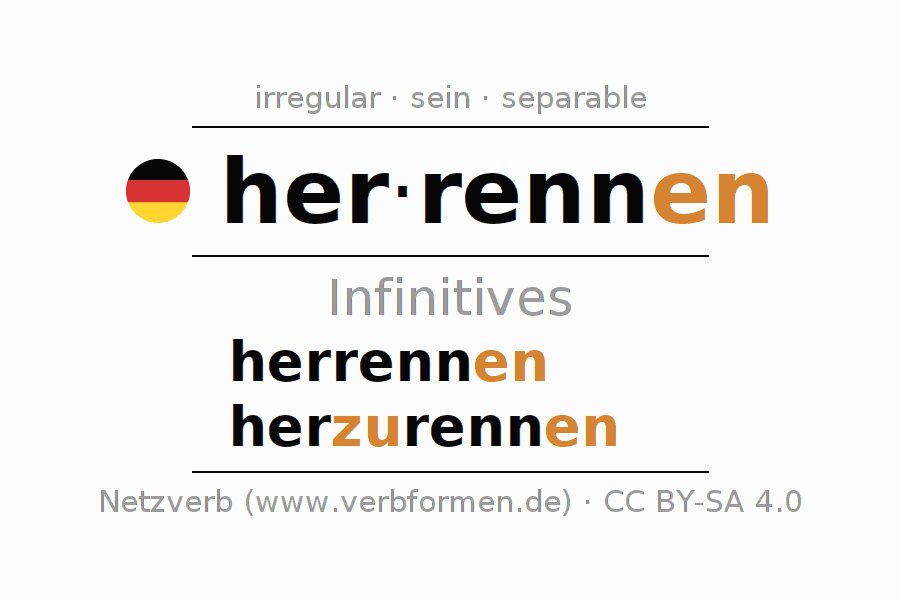 The infinitives of herrennen (chase after, run after) are: herrennen, herzurennen. The ending -en is appended to the verb stem renn. When forming the infinitive with zu the "zu" is inserted after the separable first part her-. The formation of the forms corresponds to the grammatical rules for the conjugation of verbs in the infinitive. Comments ☆