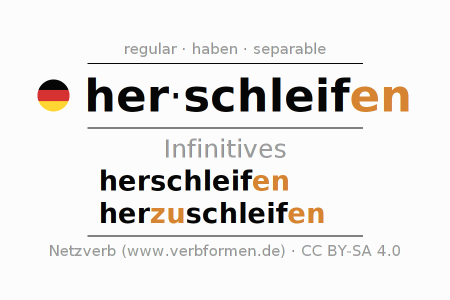 The infinitives of herschleifen (drag here) are: herschleifen, herzuschleifen. The ending -en is appended to the verb stem schleif. When forming the infinitive with zu the "zu" is inserted after the separable first part her-. The formation of the forms corresponds to the grammatical rules for the conjugation of verbs in the infinitive. Comments ☆