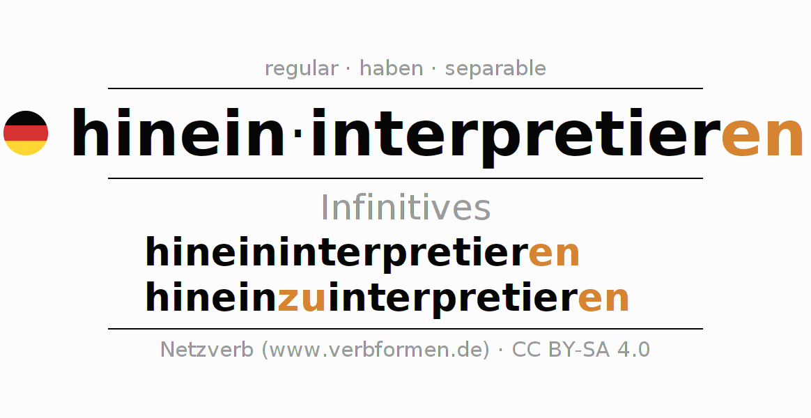 The infinitives of hineininterpretieren (read into, misinterpret) are: hineininterpretieren, hineinzuinterpretieren. The ending -en is appended to the verb stem interpretier. When forming the infinitive with zu the "zu" is inserted after the separable first part hinein-. The formation of the forms corresponds to the grammatical rules for the conjugation of verbs in the infinitive. Comments ☆