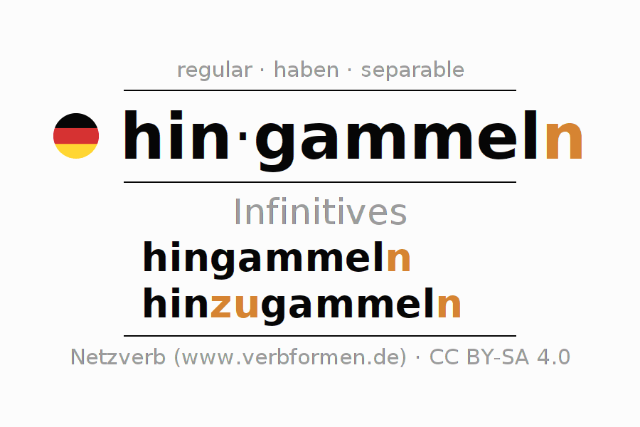The infinitives of hingammeln (dawdle, laze) are: hingammeln, hinzugammeln. The ending -n, shortened by an "e", is appended to the verb stem gammel, since the stem ends with -el. When forming the infinitive with zu the "zu" is inserted after the separable first part hin-. The formation of the forms corresponds to the grammatical rules for the conjugation of verbs in the infinitive. Comments ☆