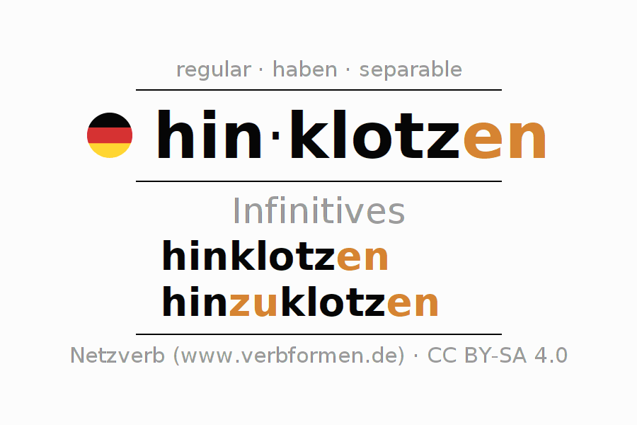 The infinitives of hinklotzen (blight, eyesore) are: hinklotzen, hinzuklotzen. The ending -en is appended to the verb stem klotz. When forming the infinitive with zu the "zu" is inserted after the separable first part hin-. The formation of the forms corresponds to the grammatical rules for the conjugation of verbs in the infinitive. Comments ☆
