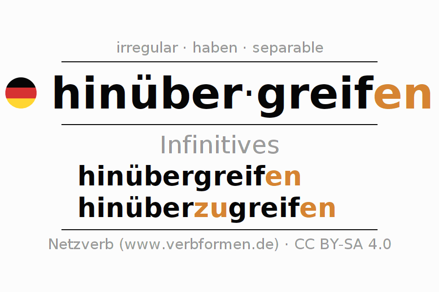 The infinitives of hinübergreifen (reach over, cross over) are: hinübergreifen, hinüberzugreifen. The ending -en is appended to the verb stem greif. When forming the infinitive with zu the "zu" is inserted after the separable first part hinüber-. The formation of the forms corresponds to the grammatical rules for the conjugation of verbs in the infinitive. Comments ☆