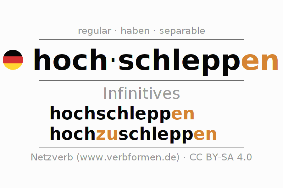 The infinitives of hochschleppen (carry up, haul up) are: hochschleppen, hochzuschleppen. The ending -en is appended to the verb stem schlepp. When forming the infinitive with zu the "zu" is inserted after the separable first part hoch-. The formation of the forms corresponds to the grammatical rules for the conjugation of verbs in the infinitive. Comments ☆