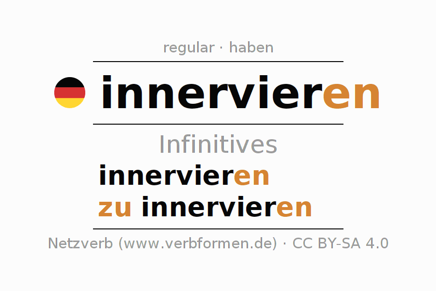 The infinitives of innervieren (innervate, excite) are: innervieren, zu innervieren. The ending -en is appended to the verb stem innervier. When forming the infinitive with zu, the "zu" is prepended to the verb, since it has no separable first parts. The formation of the forms corresponds to the grammatical rules for the conjugation of verbs in the infinitive. Comments ☆