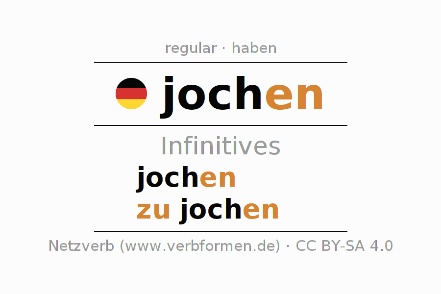 The infinitives of jochen (yoke) are: jochen, zu jochen. The ending -en is appended to the verb stem joch. When forming the infinitive with zu, the "zu" is prepended to the verb, since it has no separable first parts. The formation of the forms corresponds to the grammatical rules for the conjugation of verbs in the infinitive. Comments ☆