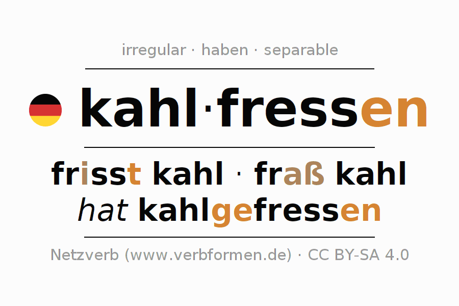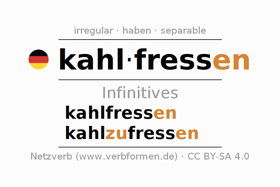 The verb kahlfressen fully conjugated in all persons and numbers in the Infinitive Present Perfect