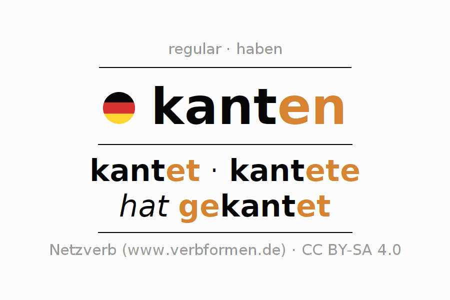 The infinitives of kanten (edge, tilt) are: kanten, zu kanten. The ending -en is appended to the verb stem kant. When forming the infinitive with zu, the "zu" is prepended to the verb, since it has no separable first parts. The formation of the forms corresponds to the grammatical rules for the conjugation of verbs in the infinitive. Comments ☆