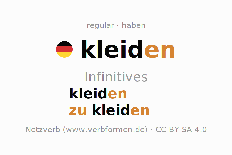 The infinitives of kleiden (dress, clothe) are: kleiden, zu kleiden. The ending -en is appended to the verb stem kleid. When forming the infinitive with zu, the "zu" is prepended to the verb, since it has no separable first parts. The formation of the forms corresponds to the grammatical rules for the conjugation of verbs in the infinitive. Comments ☆