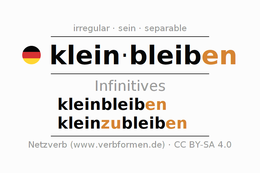 The infinitives of kleinbleiben (remain small, stay small) are: kleinbleiben, kleinzubleiben. The ending -en is appended to the verb stem bleib. When forming the infinitive with zu the "zu" is inserted after the separable first part klein-. The formation of the forms corresponds to the grammatical rules for the conjugation of verbs in the infinitive. Comments ☆