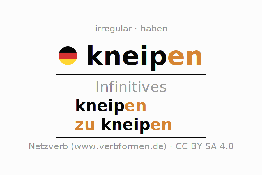 The infinitives of kneipen (drinking) are: kneipen, zu kneipen. The ending -en is appended to the verb stem kneip. When forming the infinitive with zu, the "zu" is prepended to the verb, since it has no separable first parts. The formation of the forms corresponds to the grammatical rules for the conjugation of verbs in the infinitive. Comments ☆