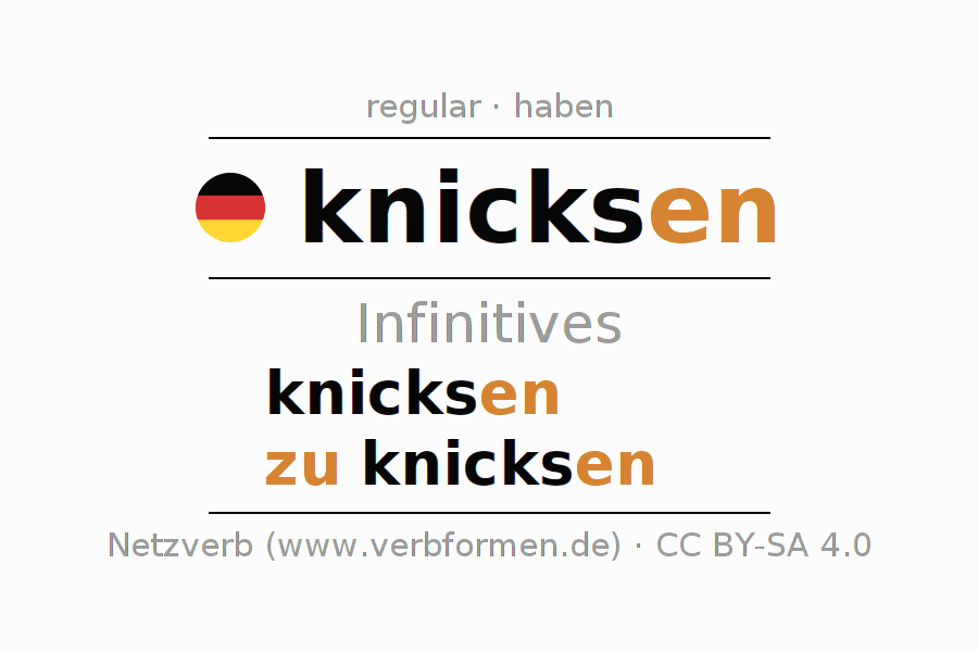 The infinitives of knicksen (curtsy, bob) are: knicksen, zu knicksen. The ending -en is appended to the verb stem knicks. When forming the infinitive with zu, the "zu" is prepended to the verb, since it has no separable first parts. The formation of the forms corresponds to the grammatical rules for the conjugation of verbs in the infinitive. Comments ☆