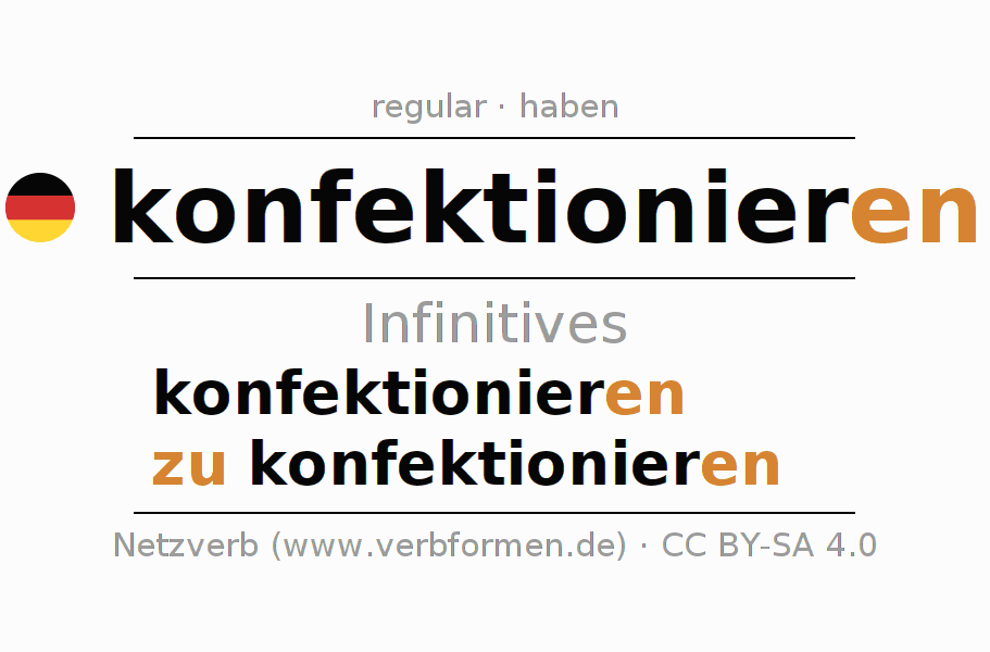 The verb konfektionieren fully conjugated in all persons and numbers in the Infinitive Present Perfect