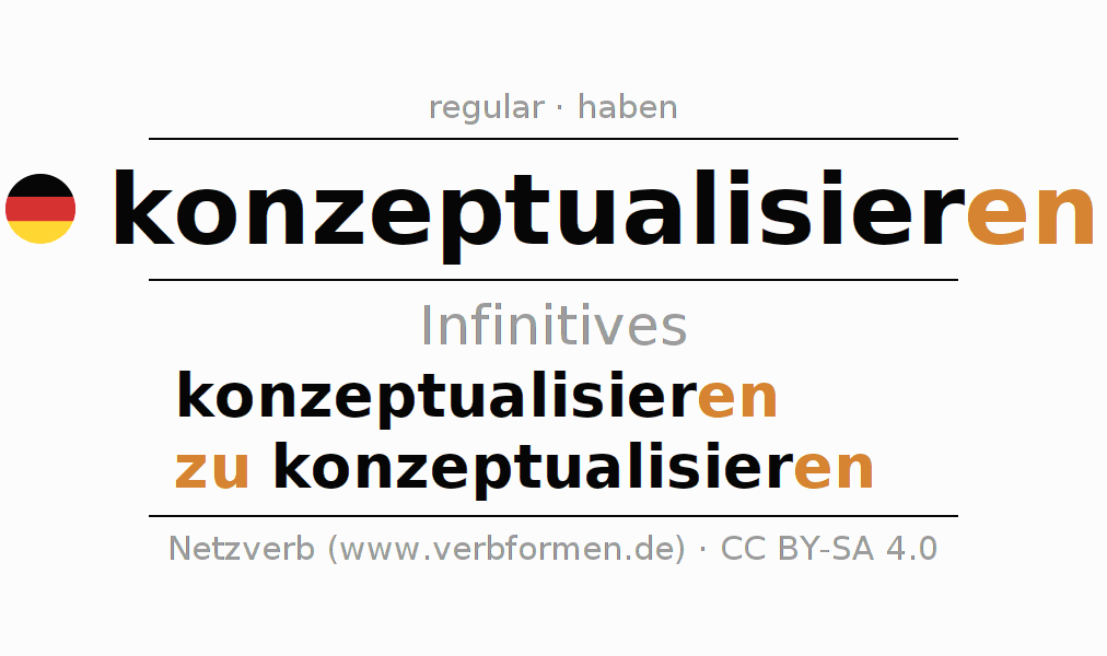 The infinitives of konzeptualisieren (conceptualize, conceptualise) are: konzeptualisieren, zu konzeptualisieren. The ending -en is appended to the verb stem konzeptualisier. When forming the infinitive with zu, the "zu" is prepended to the verb, since it has no separable first parts. The formation of the forms corresponds to the grammatical rules for the conjugation of verbs in the infinitive. Comments ☆