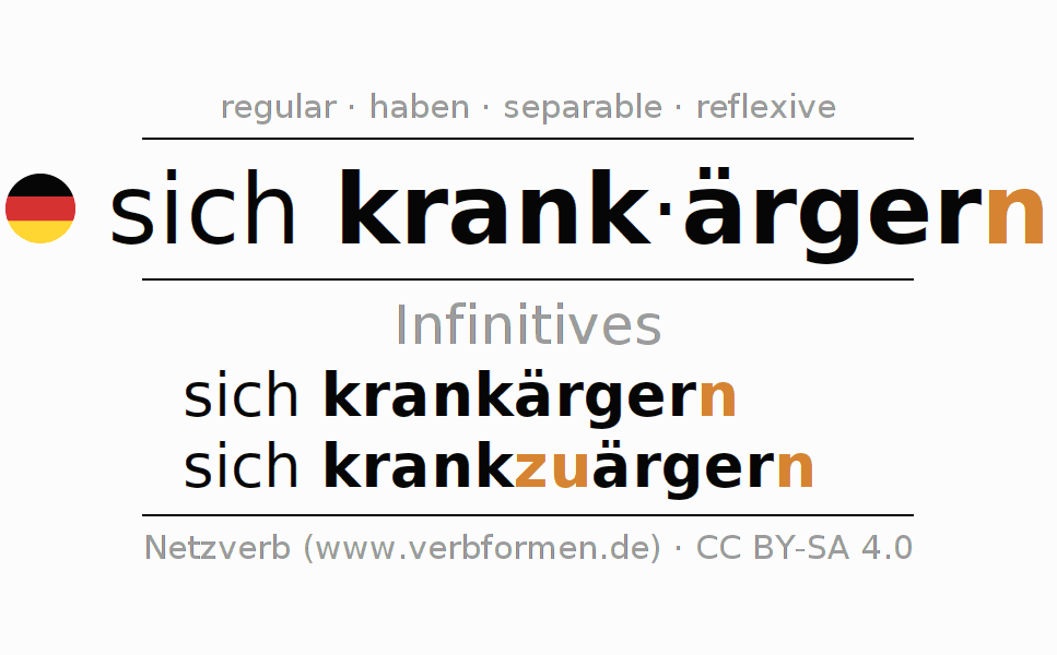 The infinitives of sich krankärgern (fret, fume) are: sich krankärgern, sich krankzuärgern. The ending -n, shortened by an "e", is appended to the verb stem ärger, since the stem ends with -er. When forming the infinitive with zu the "zu" is inserted after the separable first part krank-. The formation of the forms corresponds to the grammatical rules for the conjugation of verbs in the infinitive. Comments ☆