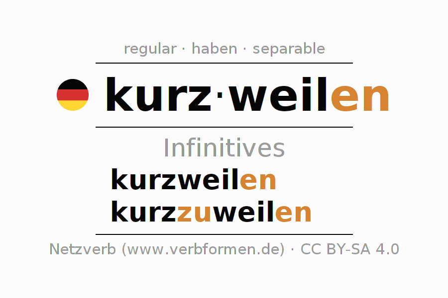 The infinitives of kurzweilen (entertain, amuse) are: kurzweilen, kurzzuweilen. The ending -en is appended to the verb stem weil. When forming the infinitive with zu the "zu" is inserted after the separable first part kurz-. The formation of the forms corresponds to the grammatical rules for the conjugation of verbs in the infinitive. Comments ☆