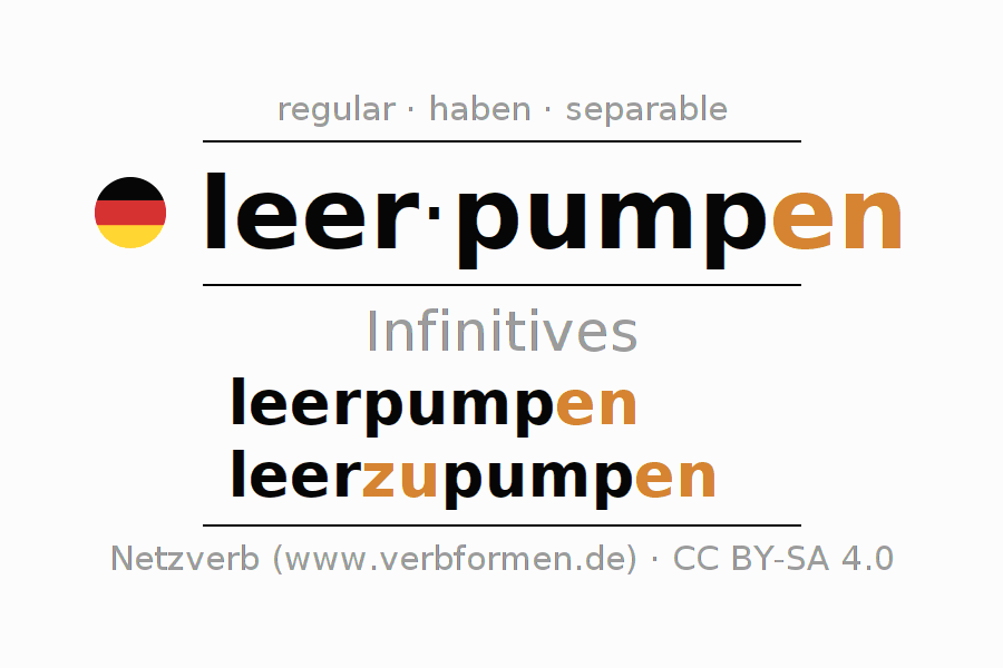 The infinitives of leerpumpen (pump dry, pump empty) are: leerpumpen, leerzupumpen. The ending -en is appended to the verb stem pump. When forming the infinitive with zu the "zu" is inserted after the separable first part leer-. The formation of the forms corresponds to the grammatical rules for the conjugation of verbs in the infinitive. Comments ☆
